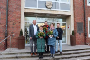 Die Gemeinde Rastede freut sich über drei frisch ausgebildete Sozialpädagogische Assistenzkräfte: Violetta Hartwig (Mitte, v.l.), Bernd Grafe und Sina Diandra Ilikkan haben in den vergangenen anderthalb Jahren die entsprechende Ausbildung tätigkeitsbegleitend absolviert. Rastedes Bürgermeister Lars Krause (links) und Steven Nicolaus (rechts), Fachbereichsleiter Kindertagesstätten, gratulierten herzlich zum erfolgreichen Abschluss.