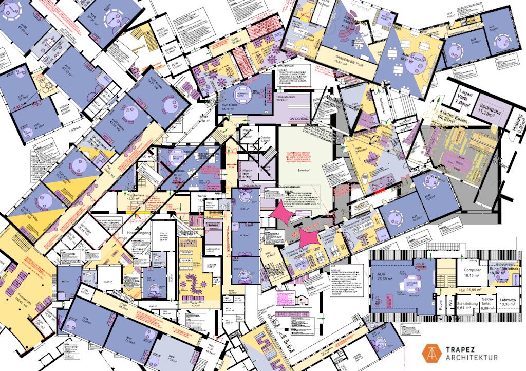 Jetzt ist die Trapez Architektur GmbH wieder an der Reihe: Erneut müssen die Ideen gesichtet, sortiert und überarbeitet werden. Mit den neuen Erkenntnissen im Kopf und einem Brandschutzexperten an der Seite wurden die Schulen erneut begangen und eingeschätzt. Auch weitere Behörden und Experten wurden mit ins Boot geholt, um sicher zu gehen, dass die Ideen, die schlussendlich vorgeschlagen werden, auch umsetzbar sind. Auch Schule und Verwaltung haben selbstverständlich keine Zeit zum Däumchen drehen. Besonders der Ganztag ist allgegenwärtiges Thema. In regelmäßigem Austausch werden hier drängende Fragen vorangetrieben: Wie können die Schulen von der zusätzlichen Unterstützung, die von der Gemeinde beschlossen worden ist, am besten profitieren? Welche Aufgabenverteilung ist effektiv?